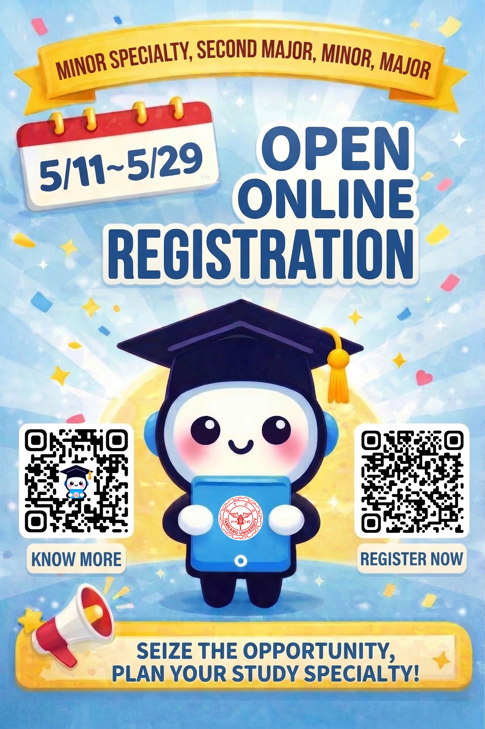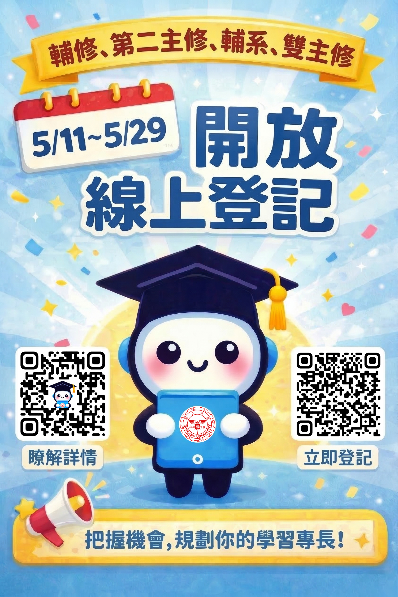 二、依本校行事曆,115學年度輔修、第二主修、輔系、雙主修申請日期自5月11日(星期一)至5月29日(星期五)止。